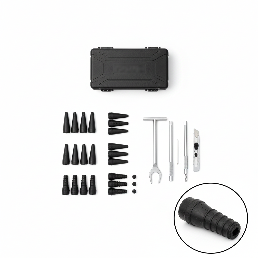 Les outils (perçoir et inserteur) sont réutilisables. Seuls les clous en caoutchouc sont à usage unique par réparation.